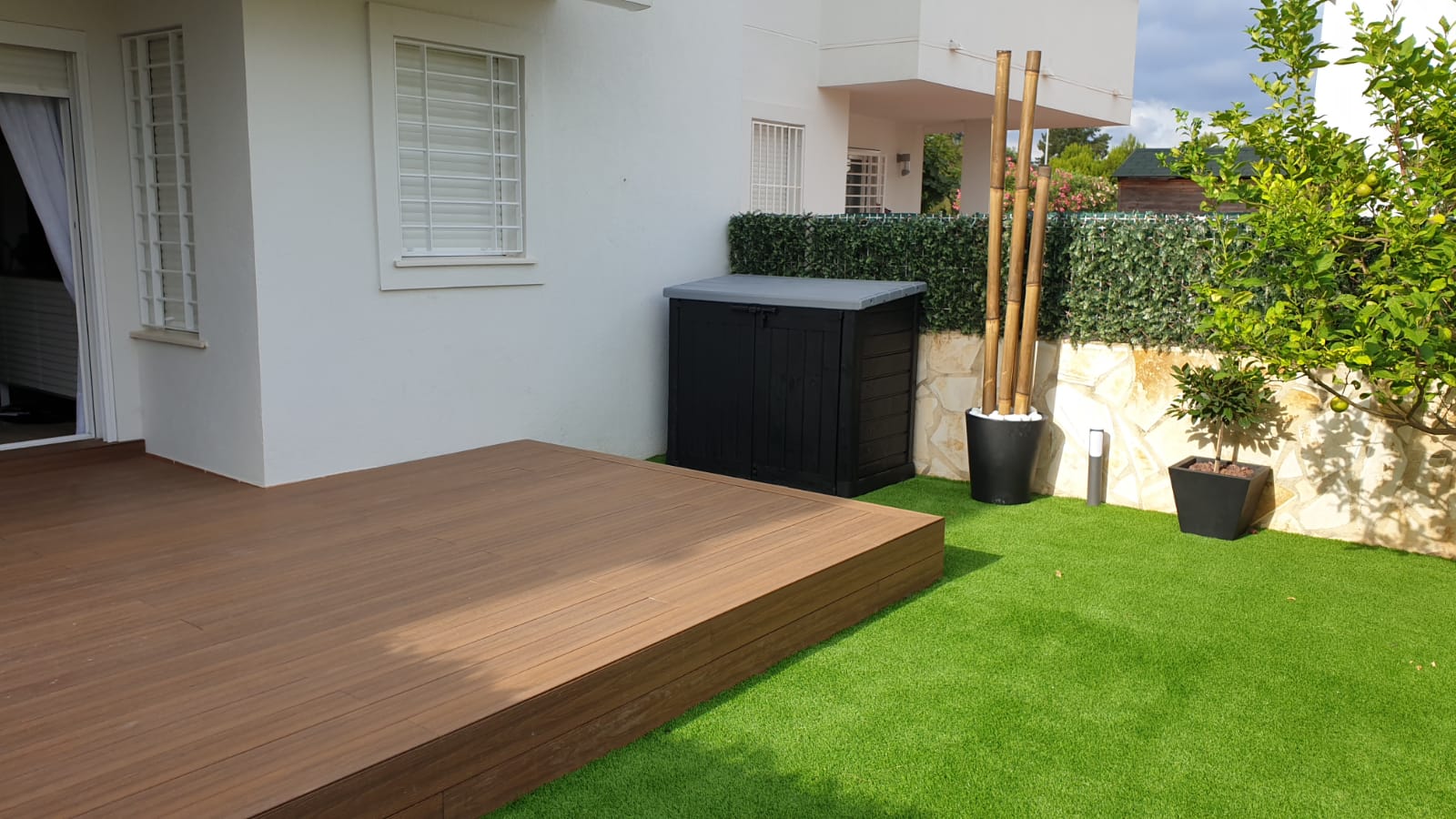 Realizamos una terraza sobreelevada. Para ello, recurrimos a la colocación de un bloque de hormigón y rastrel de aluminio. Posteriormente, instalamos una tarima tecnológica de composite alveolar encapsulada. Contaba con una textura de malla de madera de color teka. Por cierto, este material no necesita mantenimiento en exteriores. por tanto, podemos olvidarnos de lijados y aceitados. Tan solo deberemos limpiarla con agua y jabón. Y quedará perfecta cada vez que necesites darle una limpieza. ¡Como nueva!