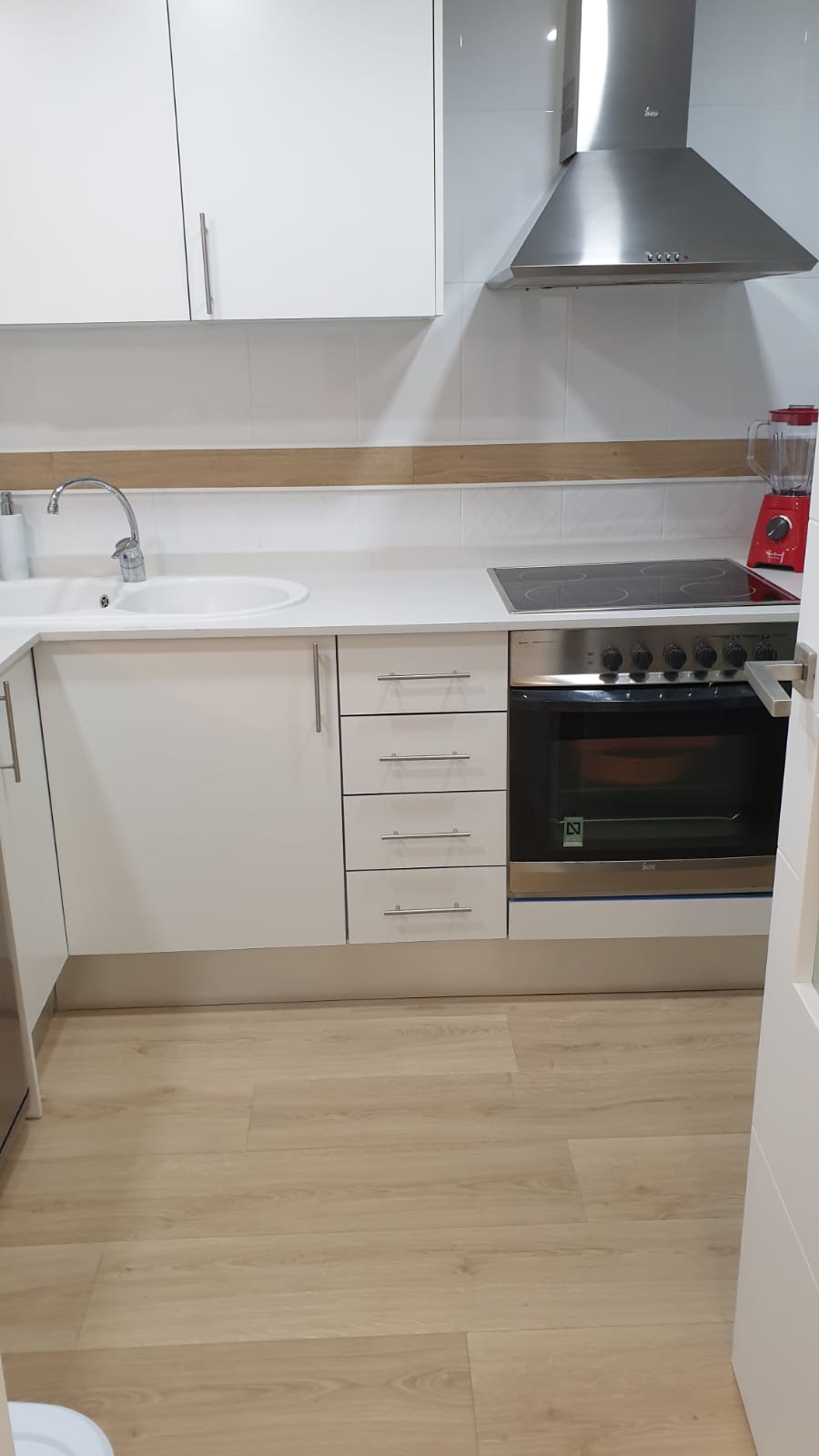 En este apartamento optamos por instalar un suelo laminado de la marca QuickStep. El modelo elegido fue el Signature color roble natural cepillado. Este material cuenta con resistencia al rayado AC4/32. Además, el suelo está rematado con un rodapié en PVC con lacado blanco aporta un extra de resistencia a la humedad con su laminado Hidroseal. Instalamos el material en toda la vivienda, incluso en zonas húmedas como la galería, la cocina o el baño. Un resultado genial gracias a los nudos, grietas y textura de este suelo laminado.