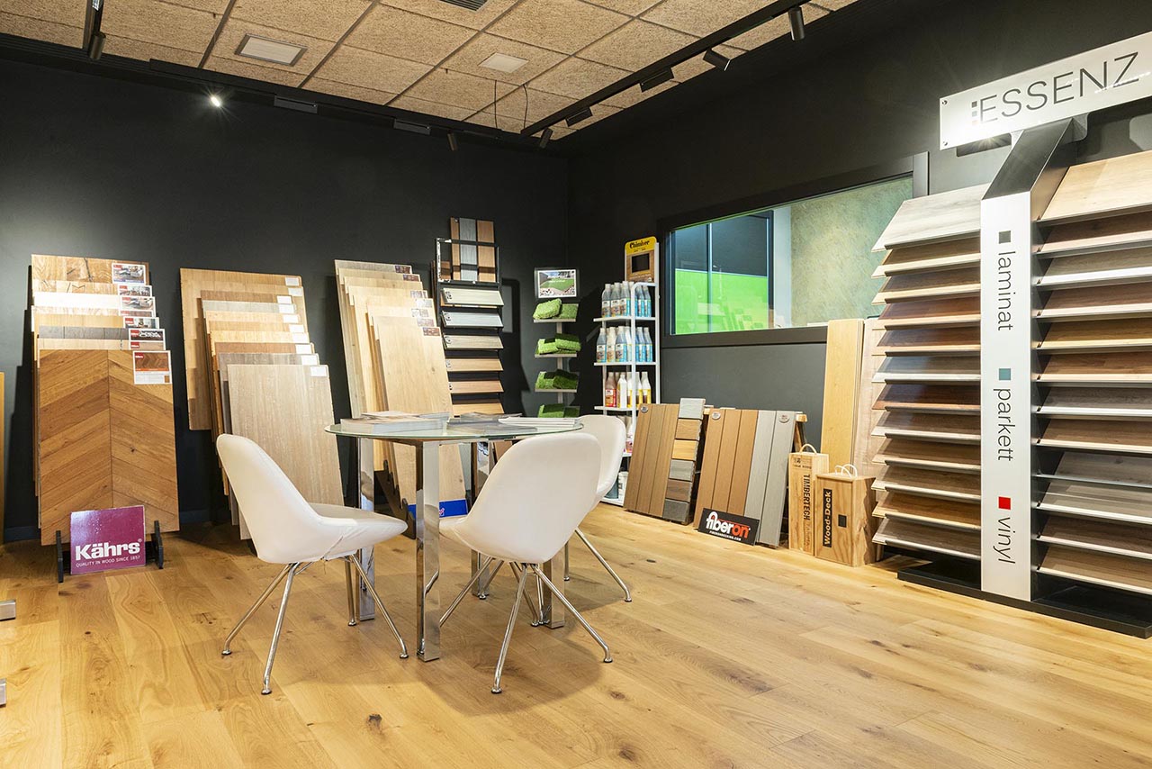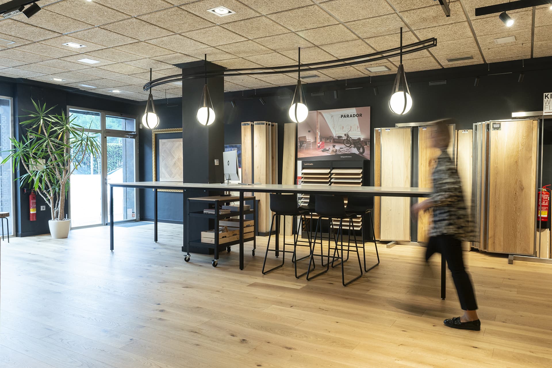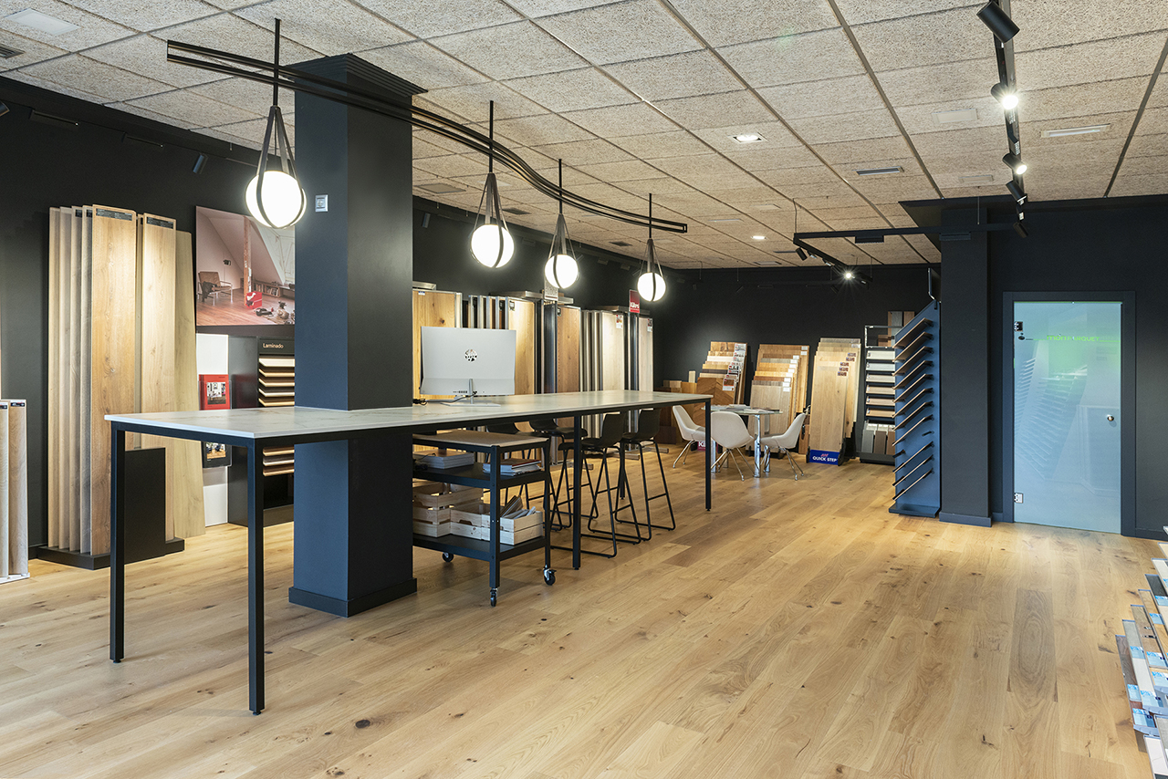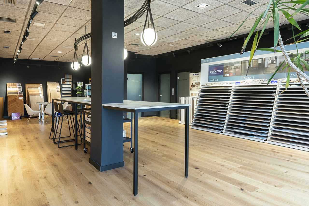 Actualmente, hemos pasado de nuestro suelo partido en varias zonas con diferentes tipos de parquet a unificar toda la superficie con una tarima multicapa flotante. Realizada en madera noble natural y barnizado en mate con una selección rústica, destaca por su remate de rodapié en dm lacado negro mate. Una apuesta muy estética, que se integra perfectamente con las paredes, pintadas también en tonos negros. Un contraste llamativo, que combina a la perfección con los expositores de madera.