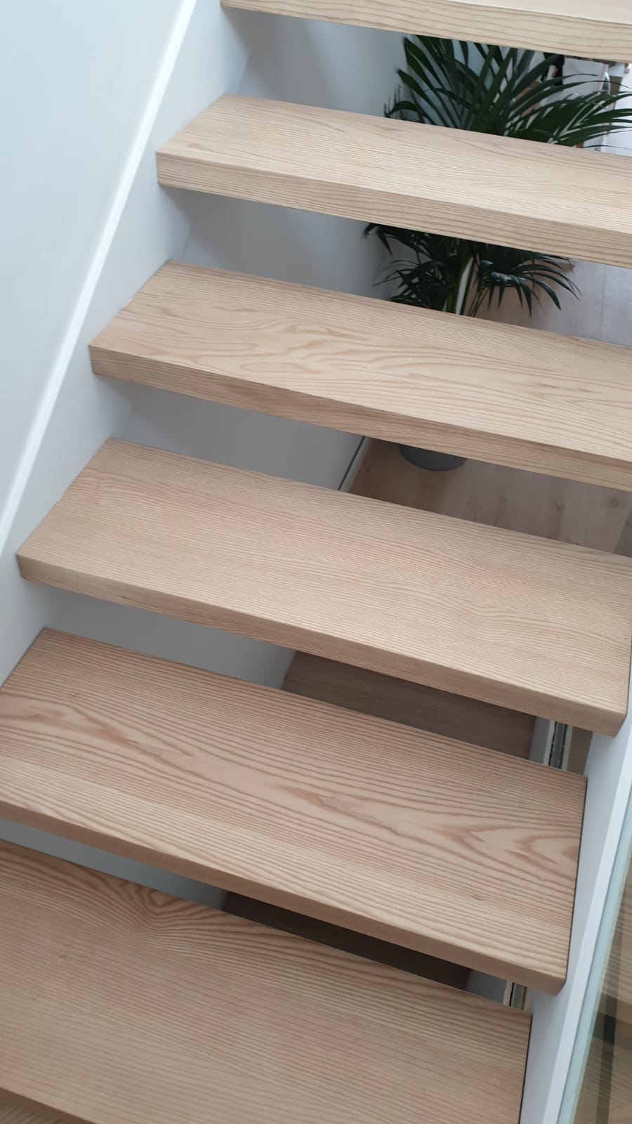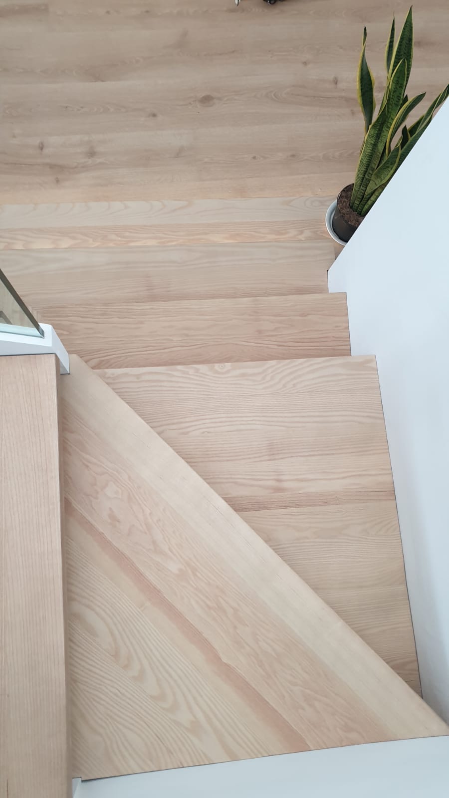 En este caso se trata de un proyecto con diferente material. La escalera está realizada con madera maciza de fresno tintado. Va a juego con el tono del suelo laminado y está acabada con barniz incoloro.