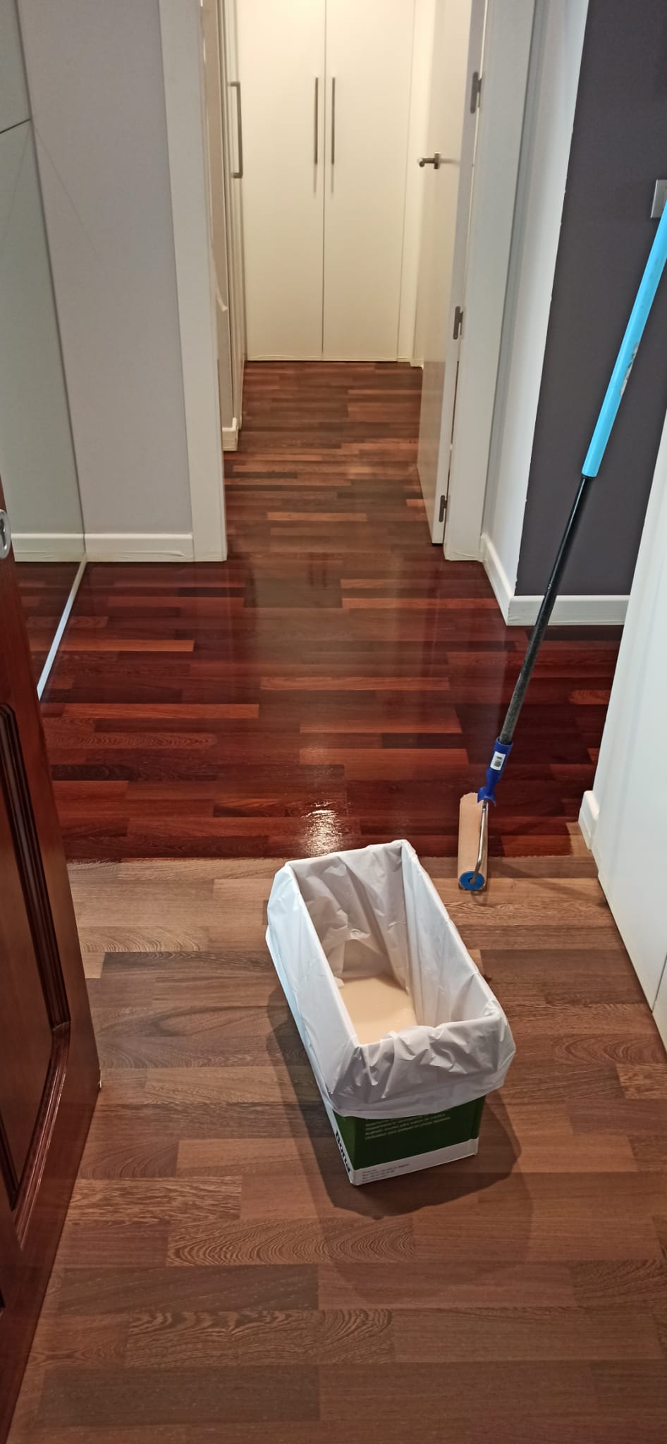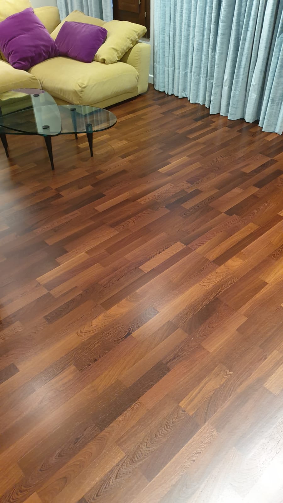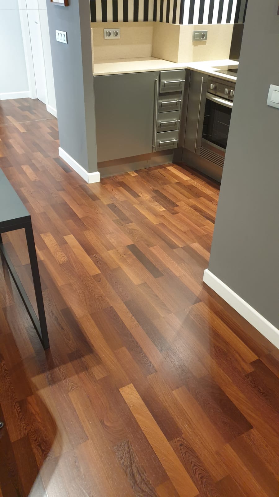 En esta tarima de interior (de tablillas en madera de wengué), hemos utilizado un barniz satinado de la marca Bona Mega.