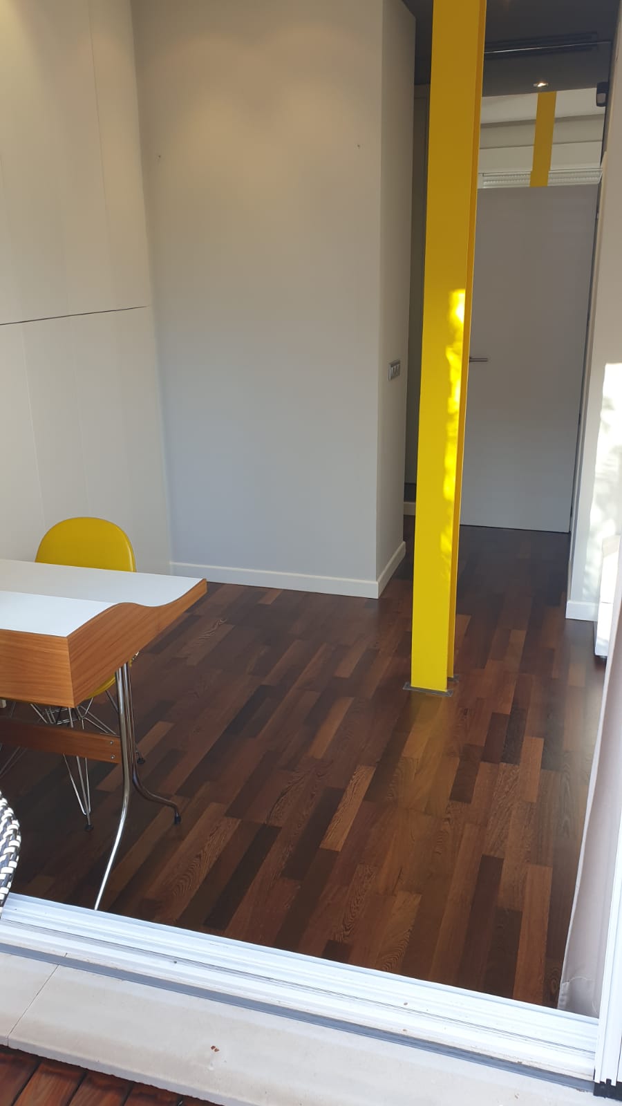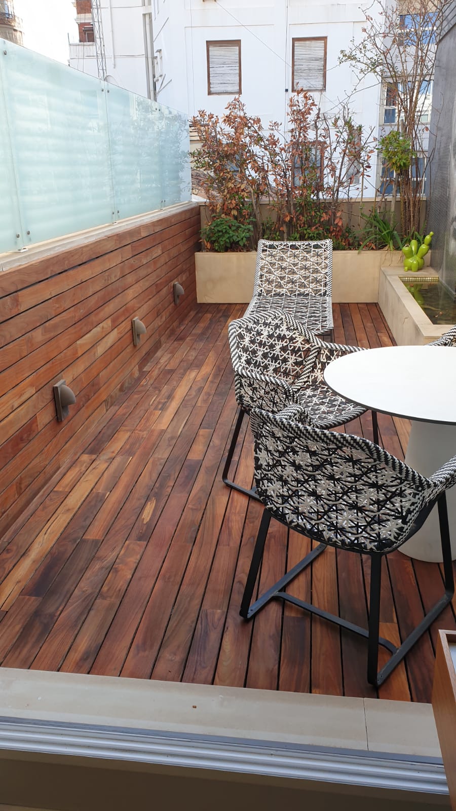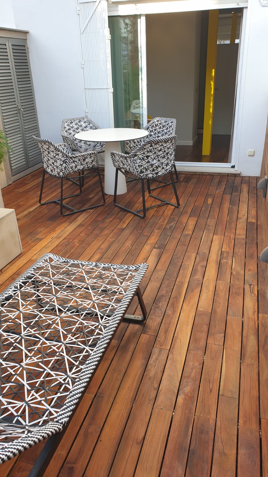 Además, la vivienda disfruta de una terraza con tarima de madera natural, que hemos lijado y aceitado. Con este tratamiento, nuestro cliente podrá disfrutarla durante los días de buen tiempo, muy comunes en la zona de Valencia. En esta tarima exterior se ha aplicado un deck oil de la marca Vermeister.